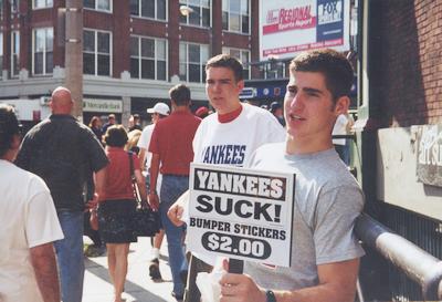 Two vendors hawking 'Yankees suck' merch back in the day. Photo by Kate Bowen